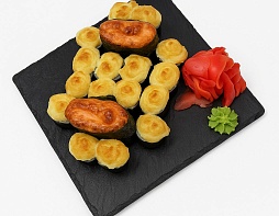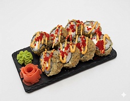 Жаренный ролл с начинкой из угря, лосося, сливочного сыра, авокадо и огурца, при подаче поливаем пикантным спайси-соусом и украшаем икрой масаго. (8шт)
