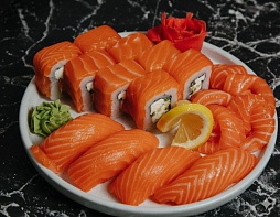 Филадельфия шеф, Суши с лососем, (4шт) Сашими с лососем (100гр).